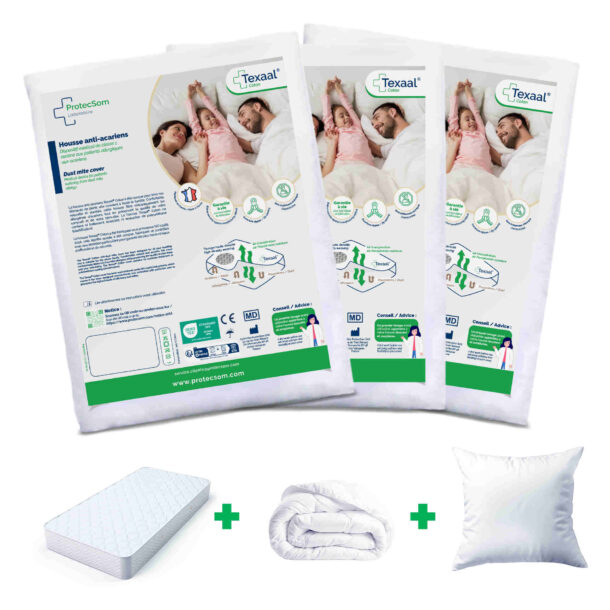 Cet ensemble complet en Texaal® Coton comprend 1 housse intégrale de matelas, 1 housse intégrale de couette, 1 housse intégrale d’oreiller offerte.